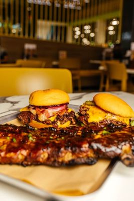 Any two Burgers from classic range and Full Rack of Pork Ribs.