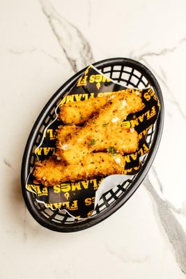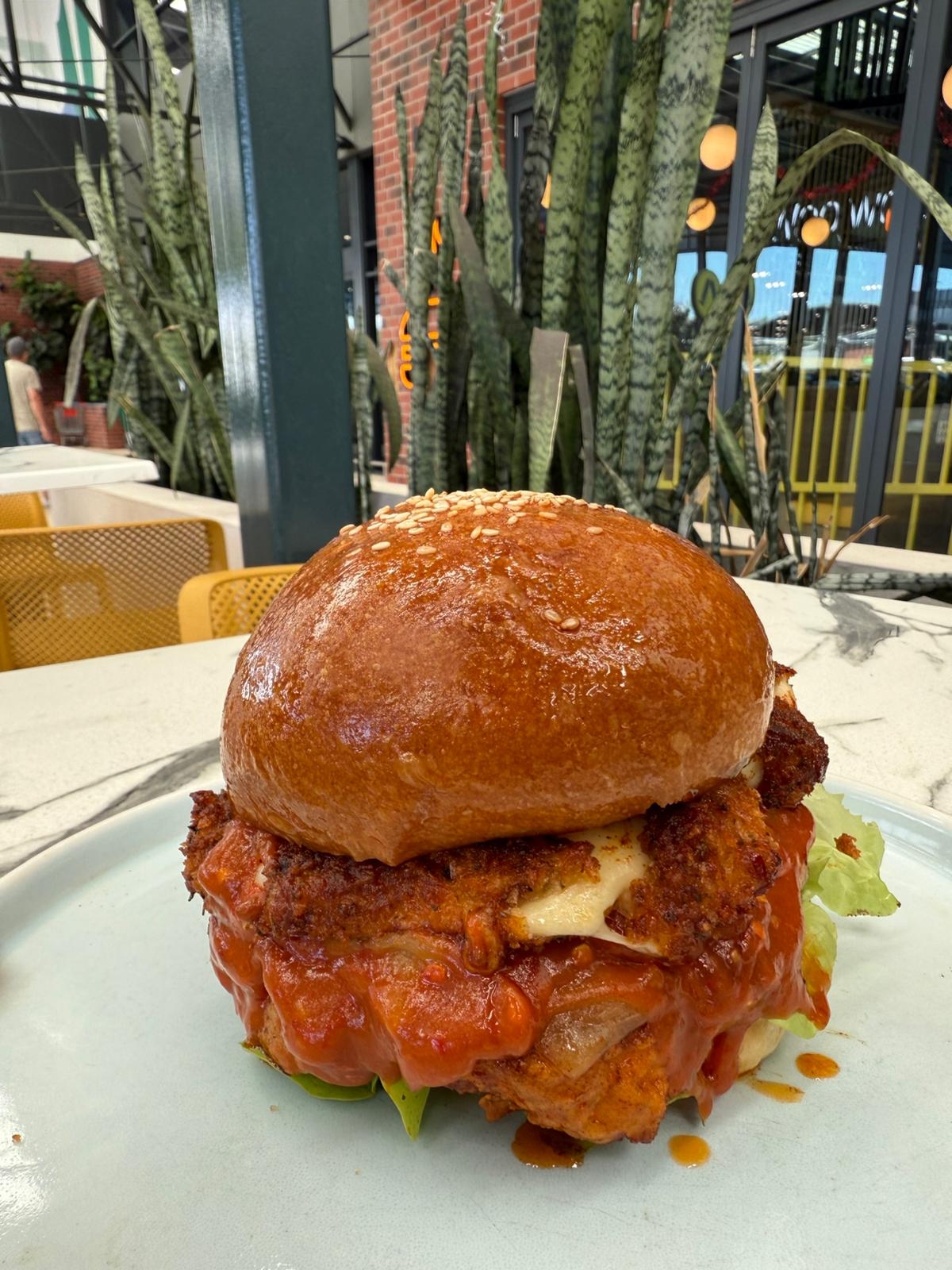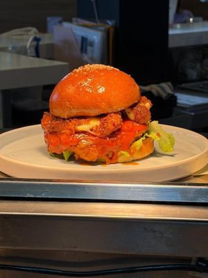 Nashville Fried Chicken, Nashville Mozzarella Sticks, Lava Sauce, Lettuce, Red Onions on Brioche Bun