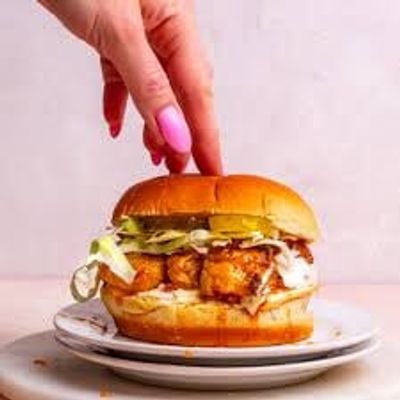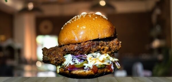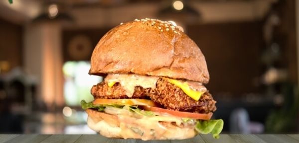 Chickpea Patty, Lettuce, Red Onions, Chilli Onion Jam, Jalepenos, Chilli Sauce, Sriracha Mayo