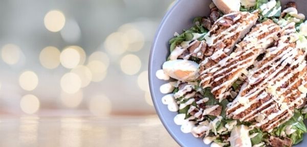 Crispy or Grilled Chicken, Cos Lettuce, Parmesan Cheese, Boiled Egg, Bacon Chunks topped with Ceaser Dressing