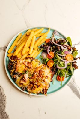 Chicken Schnitzel, Crispy Bacon Bits, Grilled Mushrooms, Onions, Grated Cheese, Creamy Garlic Sauce and Grilled Cheese