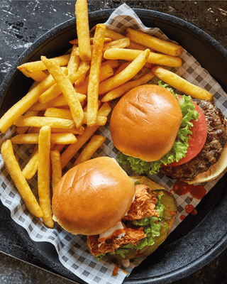 Any 2 Classic Burgers, Cheese Burger Loaded Fries, 2 pcs. Wings, 2 pcs. Mozzarella Sticks, 2 pcs. Choice of Tenders, Cheese Sauce, 1 Dipping Sauce.