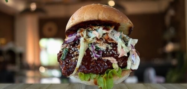 2x 130g Oklahoma Style Smashed Beef Patties with onions and Jalapenos, Bacon Jam, Havarti Cheese, Jalapeno and Sweet chili cream cheese and chipotle mayo.