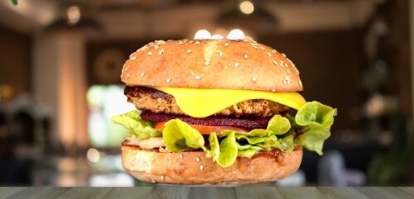 Chickpea Patty, Vegan Cheese, Smash Avo, Lettuce, Tomato Slice, Onions, Beetroot, Tomato Relish and Herb Mayo