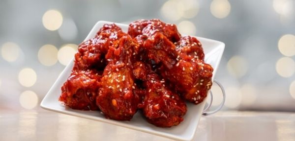 Chips, Korean Chicken Bites, Cheese, Gochujang Sauce, Hot Ginger Mayo