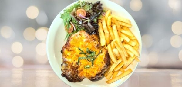 Chicken Schnitzel, Grilled Ham, Napoli Sauce and Grilled Cheese