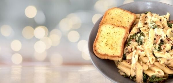 Diced Chicken Breast, Bacon, Fresh Onions, Spinach, Penne Pasta and Creamy Garlic Sauce, Parmesan Cheese