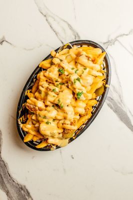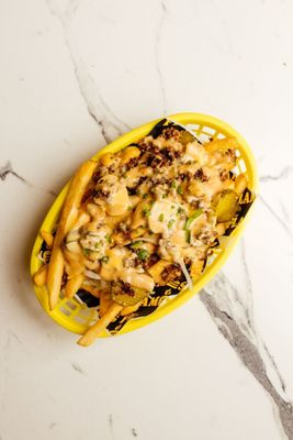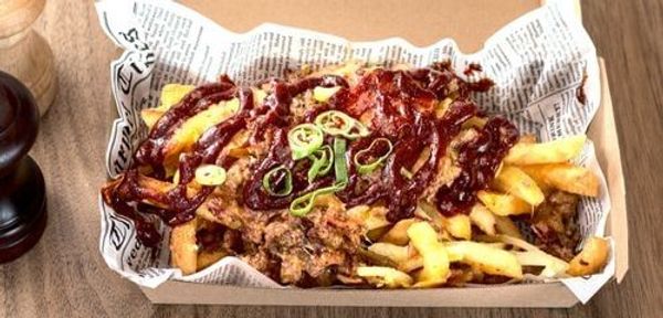Chips, Minced Meat, Bacon, Cheese, Onions and House BBQ Sauce