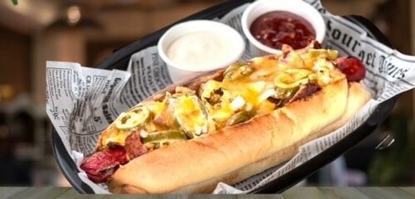 Hotdog Sausage, Buffalo Chicken Bites, Onions, Jalapenos, Cheese, Buffalo Sauce and Ranch Sauce
